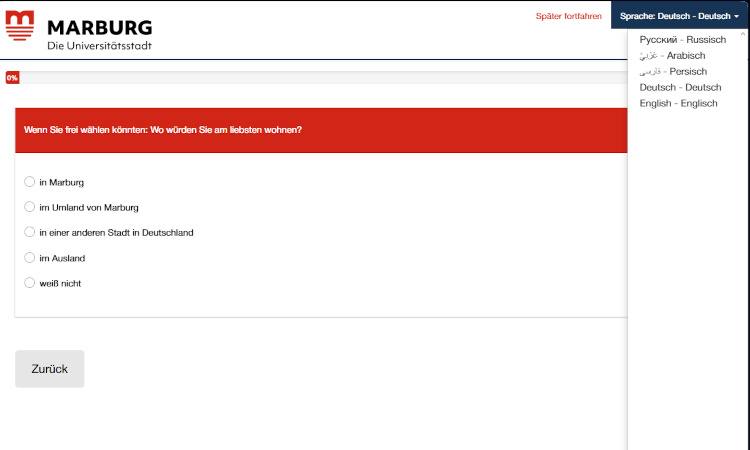 Auch Umfragen können wir mehrsprachig anbieten. Für die Universitätsstadt Marburg haben wir im Oktober eine Online-Befragung zum Ausländerbeirat umgesetzt, bei der die Teilnahme in Deutsch, Englisch, Russisch, Arabisch und Farsi möglich war – inklusive einem jederzeit möglichen Sprachwechsel.