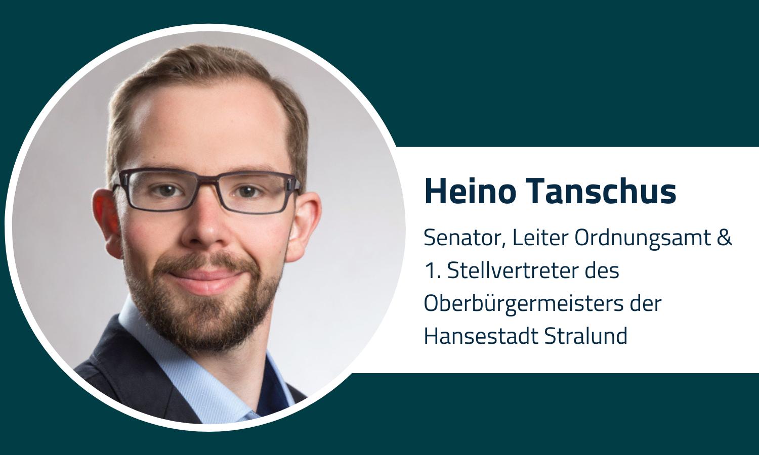 Heino Tanschus ist Leiter des Ordnungsamtes der Hansestadt Stralsund sowie Senator und Erster Stellvertretender des Oberbürgermeisters. Der Diplom-Verwaltungswirt (FH) mit Masterabschluss in Public Administration leitet bereits seit 14 Jahren das Ordnungsamt der Stadt Stralsund und verantwortet dabei 140 Beschäftigte in sieben Abteilungen. Besonderer Schwerpunkt seiner Arbeit liegt auf den Themen IT-Sicherheit, der Digitalisierung von Dienstleistungen und Geschäftsprozessen. In diesem Rahmen war Heino Tanschus u.a. für den Aufbau eines digitalen Serviceportals der Hansestadt Stralsund verantwortlich, das mittlerweile über 200 Dienstleistungen anbietet.